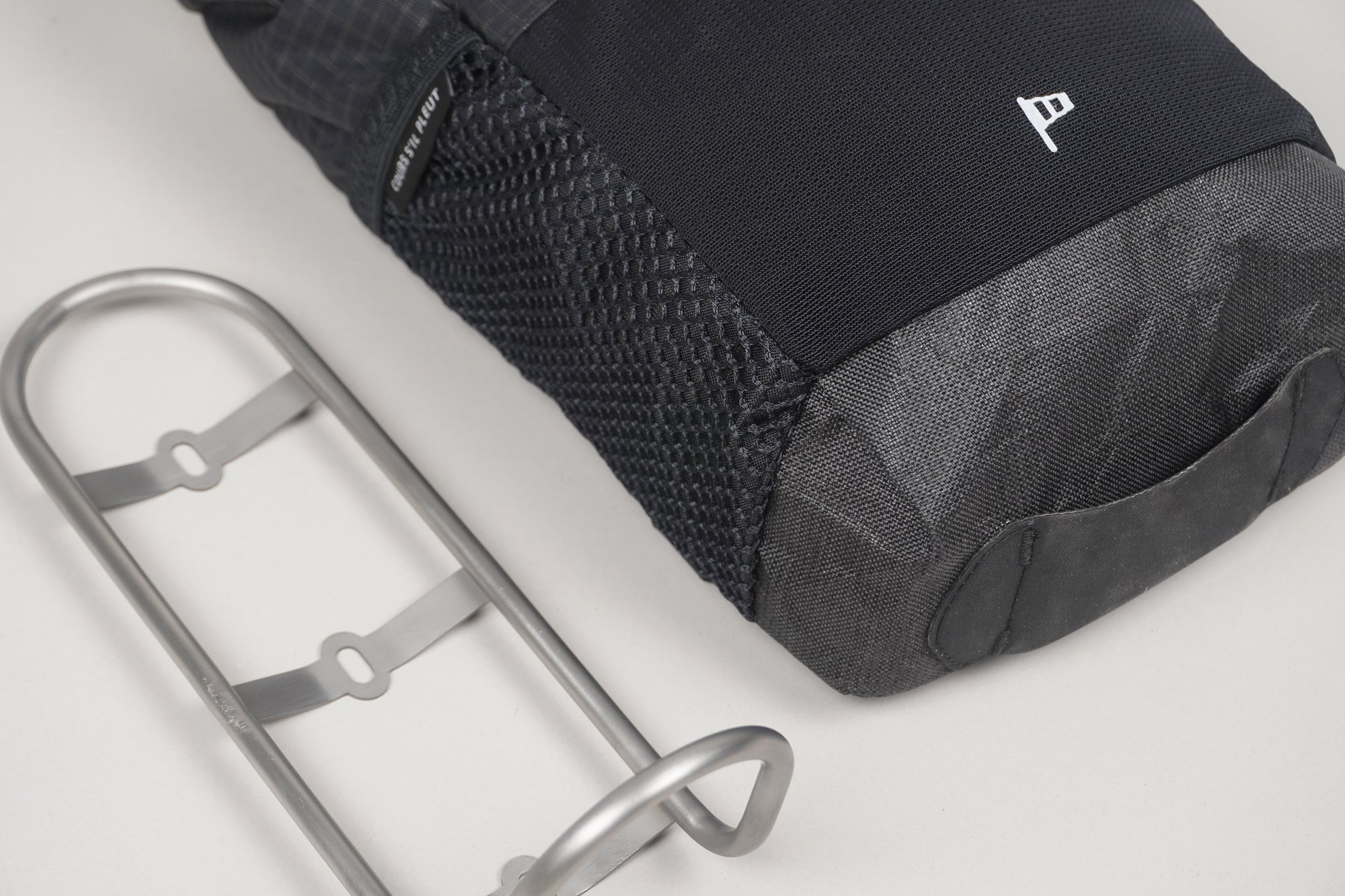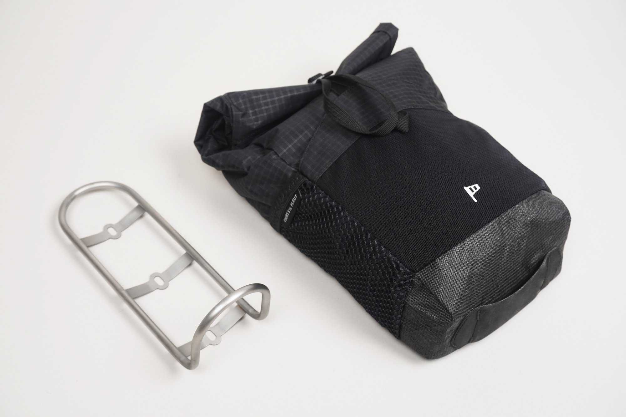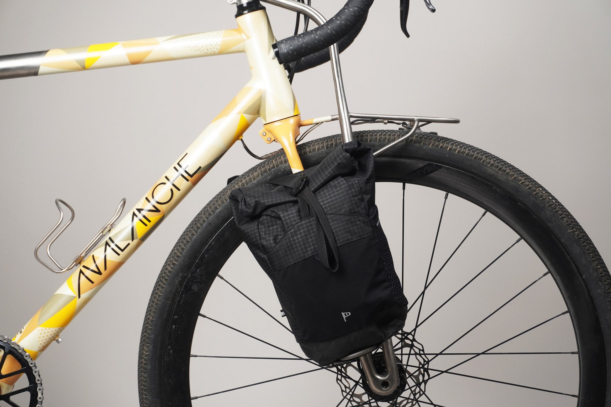 Gaëlle has designed a set of panniers that fit perfectly onto the titanium cages manufactured by the Avalanche team in their workshop. With a maximum volume of 4.5 litres each, they are spacious enough to easily store camping equipment, food or a change of clothes thanks to their rigid back and rear attachment system.
